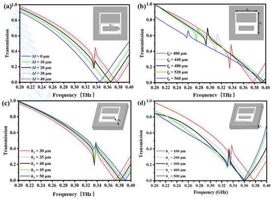 Next, we investigated the effect of different structural parameters on the transmission spectrum to optimize the sensing structure. In this structure, photosensitive silicon is not introduced firstly, and the asymmetry of the upper and lower structures is mainly realized by filling the aluminum structure in the lower frame. The asymmetry along the y-direction is represented by the asymmetry parameter Δl. Specifically, ∆l = 0 means that the upper and lower holes are equal in size, both 360 × 170 μm. When a rectangular frame structure with equal width is introduced into the lower hole, the asymmetric parameter ∆l = (l1 − l3)/2. As shown in Figure 1b, when the size of the lower hole is 280 × 90 μm, Δl = 40 μm. This means that symmetry breaking elements are introduced.