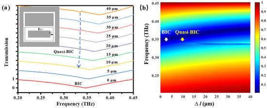 In this paper, the simulation results of the asymmetric structure are shown in Figure 2a. It can be seen that when Δl = 0, the structure is symmetrical and the system state is in the BIC state, which means that no energy leaks from the bound state to the free space continuum. With the increase of Δl, the asymmetry also gradually increases, and the transmission intensity also reaches the maximum at 40 μm. At this time, our structure breaks the symmetry to the greatest extent and reaches the quasi-resonant state. The interference between the discrete bound states supported by the microstructure and the continuous radiation in free space forms the Fano resonance lineshape with almost constant resonance positions [17,28]. It can be seen from the fitting that the Q value reaches a maximum of 1130.
