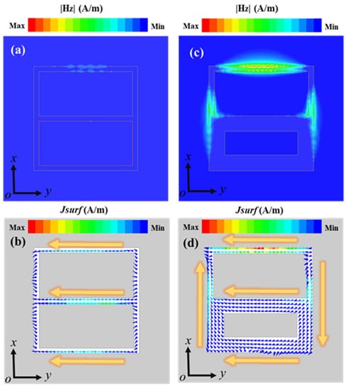 The distribution of (a) electric field and (b) surface current in the x-y plane when the structure is completely symmetrical; and the distribution of (c) electric field and (d) surface current in the plane when the structure is asymmetric (∆l = 40 μm).