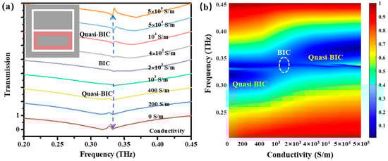 As shown in Figure 1b, when the size of the structure is optimized, the aluminum inner frame is changed to photosensitive silicon, and the electrical conductivity can be controlled by light intensity, realizing the continuous modulate of the BIC processes. Interestingly, when the conductivity is 0, although the size of the conductive structure does not change, a strong enhancement effect of the Fano lineshape appears on the photosensitive Si-metal subsurface, as shown in Figure 5a. However, with the gradually increase of the conductivity and the substantial increase of its free electron concentration, the conductive properties of photosensitive silicon will change from semiconductor-like to metal-like. When the conductivity is 1000–2000 S/m, the BIC-like state is approximately reached, and the enhancement effect is suppressed. It is easy to understand as the conductivity is further enhanced. When the electron concentration is high, the conductive properties of photosensitive silicon are similar to those of metals, and the interaction strength of photosensitive silicon with THz waves is comparable to that of metal with THz waves. At this point, the presence of photosensitive silicon can be regarded as a metal. This greatly enhances the asymmetry of the device, resulting in progressive enhancement of the Fano lineshape.
