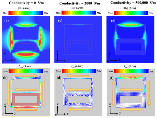 Distribution of (a) electric field and (b) surface current in the plane when the conductivity is 0 S/m. Distribution of the (c) electric field and (d) surface current in the plane when the conductivity is 2000 S/m. Distribution of (e) electric field and (f) surface current in the x-y plane at a conductivity of 500,000 S/m.