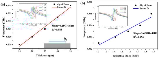Finally, we observe the sensitivity of the proposed THz sensing by varying the refractive index and the thickness of the analyte, respectively. As shown in Figure 7a, we analyze the effect of external media with different thicknesses (hf) on the transmission spectrum. When the filling structure gap and the surrounding dielectric thickness increase from 15 μm to 35 μm, there is a clear red shift in the resonance peak position. When the refractive index is from 1.23 to 1.87 that is shown in Figure 7b, the resonant peak position also has an obvious red shift. However, the increase of the thickness and refractive index has little effect on the Q value of the resonance peak and the spectral contrast.