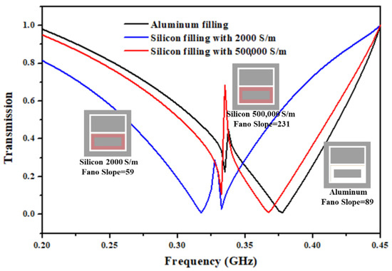It can be seen from the formula that there are two parts multiplied together. The first part of the formula is the conventional sensitivity, which characterizes the sensitivity by the amount of frequency drift. It mainly related to the change of the refractive index, and has nothing to do with the lineshape. The second part is related to the resonance lineshape. The steep slope (dI/df) of the Fano resonance help to increase the sensitivity (dI/dp). As Figure 8 shows, it can be seen that the slope of Fano resonance will increase sharply at a conductivity of 500,000 S/m, so the sensing sensitivity can be greatly enhanced about 2.60 times higher than the aluminum filling. In this way, the sensitivity of the Fano resonant structure with photosensitive silicon can reach 9.41 GHz per refractive index unit (RIU) and 0.65 GHz per micron, respectively. Moreover, compared with filled aluminum, the transmission intensity of Fano linear region of photosensitive silicon structure is increased by 2.63 times, which means that the dynamic range of the sensor is also improved. What’s more important is that the lineshape can be freely adjusted and controlled by using this structure, meanwhile the sensitivity can be optimized. Therefore, this method opens the window for ultra-high-sensitivity sensing applications.