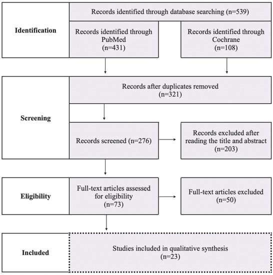 Searches of the two databases alongside hand-searching provided a total of 539 studies. A flow diagram of the search process was performed with the number of excluded/included articles (Figure 3). Following de-duplication and exclusion by title and abstract, 73 studies were obtained for full text screening. Eventually, 23 studies were included in the review. Search strategy and reasons for exclusion of each article are listed in Supplementary File S1, where included articles are marked in red color. Only those searches where the combination of key words showed new articles (not duplicated) were included. In the event that the full-text article was not available, the authors were personally contacted by e-mail to gain access to the full-text article.
