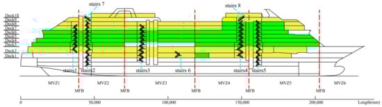 The activity space of passengers is distributed from Deck 1 to Deck 10. As shown in Figure 1, yellow areas are the public zones and green areas are cabin zones. According to the IMO guidelines, all passengers are distributed in cabins under the night scenario. Each cabin holds two passengers on this cruise ship. In the day scenario, passengers are distributed in public zones, and the number of passengers in each zone can be calculated according to the area of the zone []. The passenger capacity of the cruise ship is 948, and the initial positions of passengers in the two main scenarios are shown in Table 1.