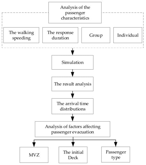 Figure 5 presents the description of the method in this paper. Firstly, the walking speed, response duration, and behavior patterns of the group and individual passengers are analyzed. Secondly, according to the obtained characteristics of passengers, the model is established, and four evacuation scenarios are simulated. Thirdly, the arrival time distributions of evacuation are analyzed through the simulation results. Finally, the influence of passenger type, MVZs, and decks on evacuation is discussed.