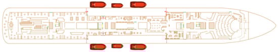 Passenger safety has always been one of the most important indicators for cruise ships. The International Maritime Organization issued the Guidelines for Evacuation Analysis for New and Existing Passenger Ships (The IMO Guidelines) [], which provided relevant provisions for passenger evacuation. The evacuation analysis of passenger ships is stipulated in the guidelines, including two main scenarios, which are day and night scenarios. In the day scenario, passengers are distributed in public areas, and they are inside cabins under the night scenario. The objective cruise ship for this paper is shown in Figure 1.
