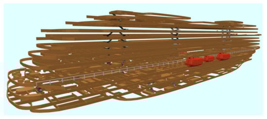 Figure 7 shows the established space model of the cruise ship, and decks in the model are connected by staircases. In the process of evacuation, passengers on other decks arrive at Deck 2 through staircases. The detailed spatial model and annotations of Decks 1–10 can be seen in Figure A13 and Table A2 of Appendix C.