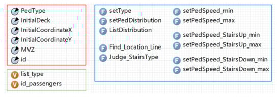 The Analogic software can define a class of groups with similar attributes by establishing an agent. Due to different types of passengers having different walking speeds and proportions, attributes of passengers can be set by establishing a passenger agent. Java can be used to write programs to realize the functions needed in the simulation process in the software. Figure 8 shows items defined in the passenger agent. The items in the red box, the green box, and the blue box are parameters, variables, and functions of the passenger agent, respectively. A detailed description of each item can be found in Table A3 of Appendix C. The defined functions can be called in the process of evacuation simulation to realize the corresponding functions.