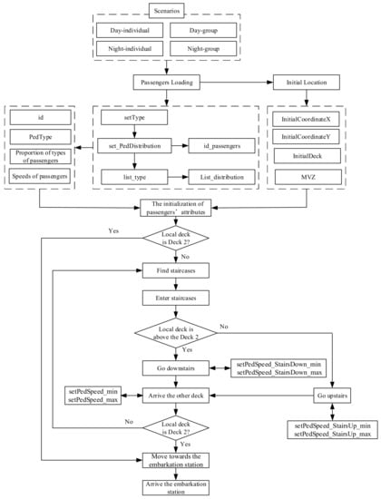 After the cruise ship evacuation space and passenger agent are established, the behavior of passenger evacuation can be set through the Process Modeling Library in the software. Each process module includes interfaces that functions can be called. Figure 9 shows the simulation process of passenger evacuation, which includes the following steps.