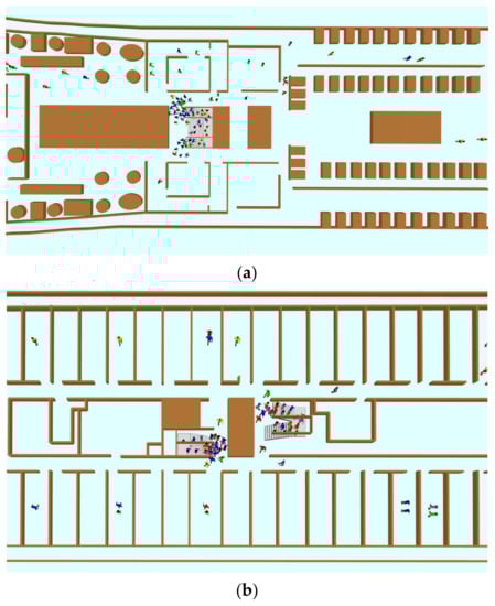 The evacuation processes of the individual and group passengers under the day and night scenarios were simulated. Each scenario was simulated 500 times according to the stipulation of the IMO Guidelines. Figure 10 presents the snapshots of the simulation. Figure 10a shows the passenger distribution on Deck 7 at 220 s under the day-individual scenario, and Figure 10b shows the passenger distribution on Deck 3 at 650 s under the night-individual scenario. It was found that all passengers were moving toward the staircases, and congestion emerged around the entrance of the staircases.