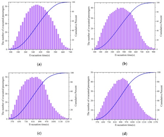 Figure 11 shows frequency histograms of the arrival time distributions of passenger evacuation. The abscissa is the time interval of the evacuation time, and each time interval is 20 s. The maximum value of the abscissa is the total evacuation time. The left ordinate represents the median number of passengers who arrived at the embarkation stations. The right ordinate is the cumulative percentage of the arrival rate. The blue curve represents the cumulative arrival rate. It can be seen from the curve that the slope of the curve is small when the arrival rate is less than 10%. However, the slope of the curve suddenly increases when the arrival rate exceeds about 10%. Within the range of 10–90%, the curve slope barely changes, indicating that the arrival rate of passengers at this stage is stable. In addition, it can also be found from the histogram that many people are arriving in unit time during this stage, but the arrival number experiences little change within a time interval. When the arrival rate exceeds 90%, the arrival number of passengers in a time interval begins to decline significantly, and the slope of the curve also suddenly becomes shallower. Therefore, this paper considers the period when the cumulative percentage is in the range of 10–90% as the peak period of arrival.