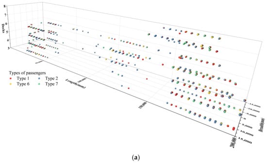 In addition, evacuation planning is also one of the ways to keep people safe. Evacuation planning establishes a complete emergency plan from a macro point of view. Planning can avoid or minimize the impact of emergencies by building a safe and sustainable environment. The planning approach helps to reduce risks and enhance emergency preparedness through exercises []. However, the stay time of passengers on the ship is short, and there is a lack of adequate exercise opportunities. Hence, this paper mainly uses simulation methods to analyze the evacuation process of different types of passengers on cruise ships and explore potential ways to improve evacuation efficiency.