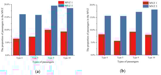 Table 5 shows the proportions of passengers whose initial locations are in different MVZs. In the first 10% of arriving passengers, the proportions of passengers in MVZ 2, 3, and 4 are significantly larger than the other two MVZs. As can be seen from Figure 1, staircases are set on both sides of MVZ 2, 3 and 4, and passengers in these MVZs can evacuate from two directions. Meanwhile, staircases are only arranged on one side of MVZ 1 and 5, and passengers can only move in one direction in the process of evacuation. Therefore, the evacuation efficiency of MVZ 1 and 5 is lower than that of the other three MVZs. For the last 10% of arriving passengers, the proportions of passengers in MVZ 3 and 5 are larger than other MVZs in the day scenario. As can be seen from Table 1, the number of passengers in MVZ 3 is the largest in the day scenario, which may lead to the higher value of the proportion of passengers in MVZ 3. Meanwhile, the reason for the high proportion value of passengers in MVZ 5 is also the layout of the staircases. For the same reason, the evacuation efficiencies of passengers in MVZ 1 and 5 are low under the night scenario, resulting in the proportions of passengers in these two MVZs being significantly higher than other MVZs. Since the initial number of passengers in MVZ 5 is larger than that in MVZ 1, the value proportion of MVZ 5 is higher than that of MVZ 1.