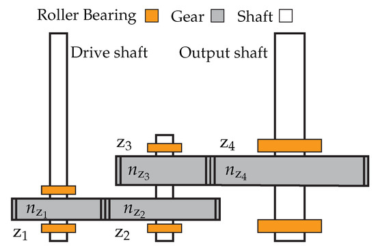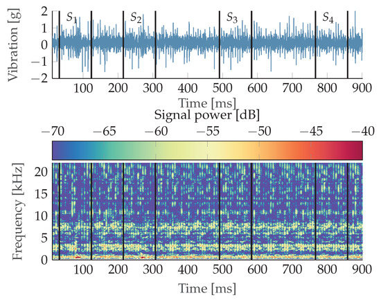 In the following, the vibration signal of one gear revolution at a rotational speed approximately of 200 rpm is considered as an example for each gear. For this purpose, the recorded vibration signal is transformed into the time–frequency domain as a spectrogram. Spectrograms of vibration signals are determined in digital signal processing via the discrete short-time Fourier transform (STFT). The discrete STFT