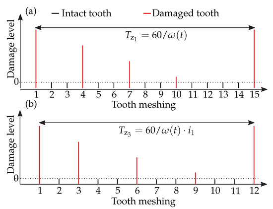 Figure 8. The peaks in the bottom plot correspond to the damaged tooth meshes. In addition, it can be seen that there are no anomalies in the signals in the areas after the damage, and thus the intact meshes are not influenced by the damaged ones before them. The vibration signal used for this spectrogram was recorded at the gearbox with damage to gear