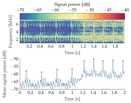 In the spectrogram, recurring significant distinct frequencies can be recognised. Furthermore, an increase in the total signal power can be seen from about one second onwards, due to the increase in rotational speed at this point. The average calculated signal power in the range of 1–7 kHz also shows the signal peaks. The total average power increase due to the increased speed can also be seen in this diagram. Furthermore, it can be seen that the period duration decreases due to the increasing speed. The average period