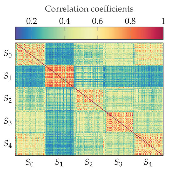 The main diagonal of the matrix shows the correlation of the respective signal with itself. Accordingly, the main diagonal shows correlation coefficients of 1. Furthermore, the blocks on the main diagonal also show increased values, due to the similarity of the individual signals of a damage level. The other blocks thus show the similarity between the individual damage levels. Noticeably, the block from