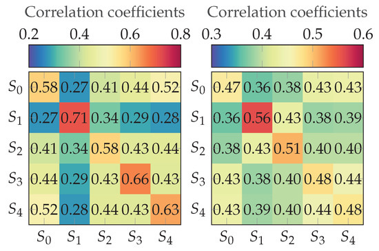 The main diagonals of both correlation matrices show the highest values of the respective damage levels in this observation. This can be explained by the high similarity of the periodically occurring gear meshing. Overall, the mean correlation coefficients of the gearbox with damage to gear show significantly higher correlation coefficients than those of the gearbox with damage to gear , due to the longer signal length caused by the slower rotational speed. For the correlation matrix of the measurement series on the gearbox with damage to , it can be seen that the damage level clearly distinguishes itself from the others. It shows an increased correlation of 0.71 to the signals among each other. Furthermore, clearly differs from , and . The slight similarity of to indicates that the damage level also exhibits recognisable characteristics. The damages and show the highest similarity to the reference signal . From this it is concluded that these two signals do not show clear distinguishability and thus the damage level cannot be detected. The correlation matrix of the measurement series on the gearbox with damage to shows a comparable pattern. Here, especially damages and , stand out from the other damages and show an increased correlation to each other. Furthermore, damage shows the highest correlation among the signals, due to the distinctive signal behaviour already recognised in the spectrograms. Since damages and show the greatest similarity to the reference signals , no distinguishability of the damages appears to be possible.