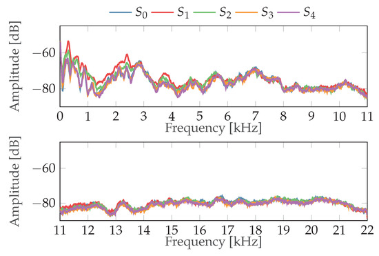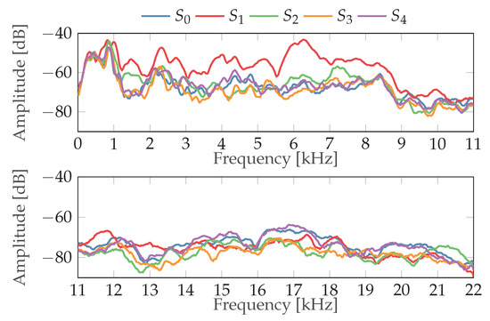 Figure 11 shows that all spectra have a more distinctive behaviour in the lower frequency range. Overall, the higher frequencies show lower amplitudes. In the range below 1 kHz and above 13.5 kHz, the spectra hardly show a distinguishable behaviour. The figure shows that the largest damage,