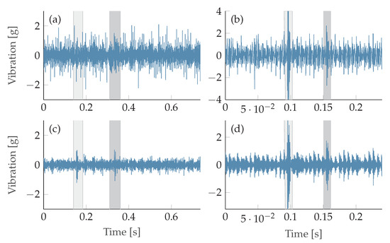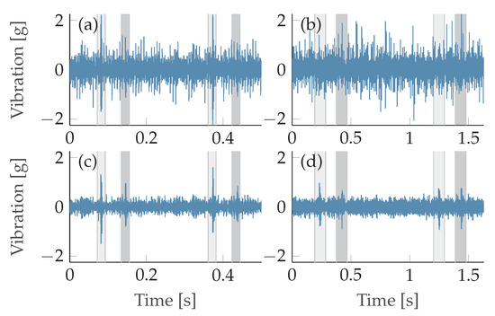 Section 2.3. The highlighted signal parts were determined based on the spectrogram, the rotational speed and the known geometry of the synthetic damage. The highlighted areas correspond to the proportionate duration of the respective teeth meshes. The largest damage (