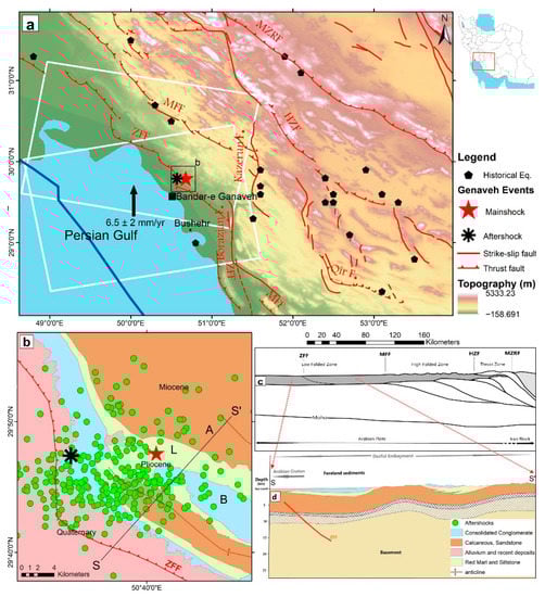 On 18 April 2021, at 6:41 UTC (11:11 Iran Standard Time), a MW 5.8 earthquake occurred near the city of Bandar-e Genaveh, in the seismically active area of the Bushehr province, southwestern Iran (Figure 1). This earthquake occurred in the strongly active area, with structures oriented mostly northwest-southeast and dominated by right-slip and reverse fault mechanisms [1,2]. It did not cause casualties, extensive damage or surface ruptures in the affected area [3]. There were 200 aftershocks following this earthquake over the next 4 months, with 20 of a magnitude higher than 4 [4]. Among them, a large aftershock of Mw 5.0 occurred on May 21, potentially causing additional surface displacements.