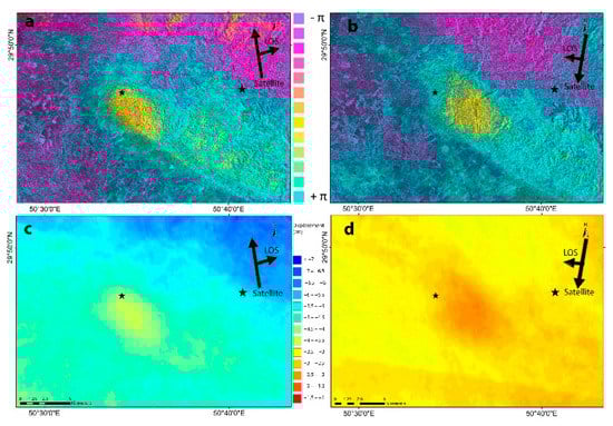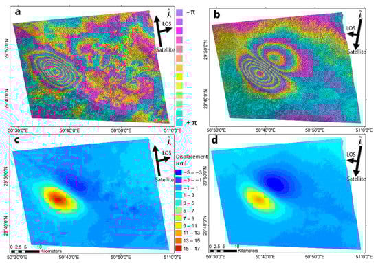 Interferometric fringes (a,b) and displacement maps (c,d) for ascending (left) and descending (right) orbits for the 2021 Genaveh mainshock. Positive displacement indicates a movement toward the satellite (e.g., uplift), whereas negative displacement indicates a movement away from the satellite (e.g., subsidence).