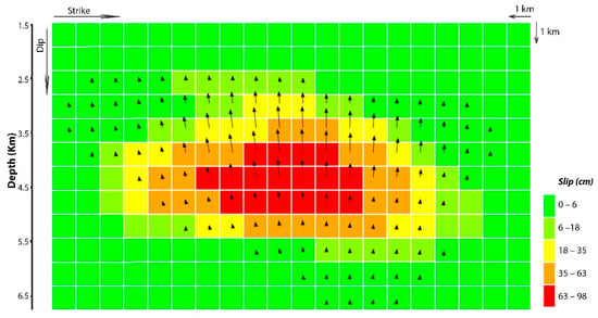 To calculate the slip distribution of the source, using the linear inversion described in the previous section, we firstly extended the fault planes so that the source could include the entire slip distribution, from the peak value to zero, at the edges; the fault was then subdivided into patches of 1 × 1 km. According to the slip distribution (Figure 4), the maximum slip of approximately 1 m was located at a depth of 4.5 km; the slip distribution is constrained between a depth of 2.5 km and 6.0 km, thus confirming that the rupture did not reach the surface. The comparison of the observed and modeled displacements after the linear inversion is shown in Figure 5, along with a map of residuals; observed and predicted displacements differ by less than a centimeter on most of the map, but with very localized fluctuations up to 3 cm, due to the unavoidable approximations introduced by the elastic model.