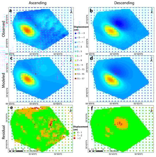 Observed, modeled and residual maps for displacements obtained from ascending and descending orbits for Mw 5.8 mainshock. The red star shows the location of mainshock.
