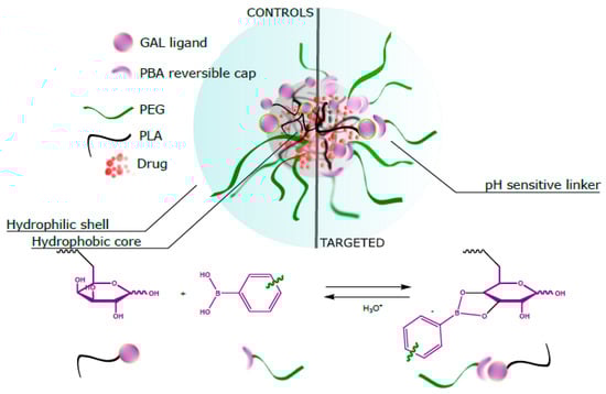 Although active targeting can improve the uptake in a specific cell/tissue, it is not always a solution for the dilemma, but it requires the ligand to be appropriately presented. The best scenario would be the one in which PEG detachment and ligand presentation are concerted and do not depend on different physical phenomena characterized each by their own kinetic and pH sensibility. The strategy proposed in this research is the development of a liver targeted drug delivery system where the block condensation, the stimulo-responsiveness for hydrophilic shell loss, and the active targeting ligand presentation coexist in a unique element. This is a pH-reversible boronic ester formed between a Gal and a PBA residues at the core–shell interface. During the research, we successfully settled a synthetic pathway leading to MeO-PEG2000-PBA and PLA-Gal of two different Mws in order to explore a broader applicability. Overall, the study confirms the presence of a functional free boronic acid end-cap on the PEG derivative and shows the ability of MeO-PEG-PBA to form a pH adaptive boronic ester with Gal, efficiently targeting hepatocytes, being recognized by the ASGPR receptor since asialoglycoprotein is hyper-expressed on hepatocytes’ membrane. It shows also that the formation of the two blocks should occur in a basic environment to maximize the yield of the hydrophilic corona installation. The obtained preliminary results encourage us to move towards a future perspective of exploring the best conditions, which enable the preservation of the integrity of the polyester and the use of a suitable base, in aqueous or organic medium. Light should be also shed on the kinetic stability of the construct: being the bond at the interface between the hydrophobic core and the hydrophilic shell, it is likely that this would influence the dissociation of the blocks, the rate at which the PEG dissociates at pH 7.4 from the nanoparticle surface. Finally, the work represents the proof of concept for our approach suggesting an alternative way of thinking about active targeting and the ligand presentation strategy.