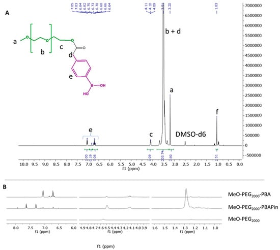 (A) 1H NMR spectra of MeO-PEG2000-PBA in DMSO-d6 (400 MHz) and attribution of the signals to the structure. “f” signal has been attributed to free pinacol residue. (B) Comparison of the characteristic peaks in the 1H NMR spectra of MeO-PEG2000-PBA, MeO-PEG2000-PBAPin and MeO-PEG2000. Note the appearance of the peak at ~4.1 ppm relative to the methylene of the esterified end of MeO-PEG2000-PBAPin, still found in the spectrum of the deprotected derivative MeO-PEG2000-PBA (panel in the middle), the methyl signal of the pinacol at 1.3 ppm in the spectrum of MeO-PEG2000-PBAPin (right panel), and the aromatic protons of PBA in both MeO-PEG2000-PBAPin and MeO-PEG2000-PBA spectra (left panel).