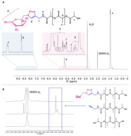 (A) 1H NMR spectrum of PLA-Gal in DMSO-d6 and signal attribution; (B) detail of PLA, PLA-Alk and PLA-Gal spectra in the alkyne proton region (2.15 ppm). Note the complete disappearance of the signal after the click reaction. Spectral signal and structural elements are correlated by lowercase letters.