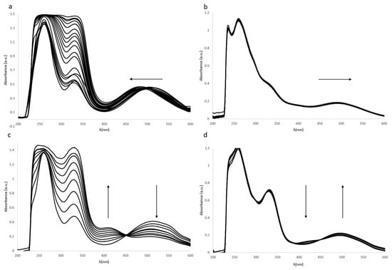 The 200–600 nm spectral changes during competitive binding in three components assay at two different pH. (a) Absorption of ARS and ARS/PEG2000-PBA boronic ester at pH 7.4. The arrow indicates the shift occurring upon addition of increasing concentrations of PEG2000-PBA to ARS; (b) absorption of ARS and ARS-boronic esters in equilibrium at pH 7.4. The arrow indicates the shift occurring upon addition of increasing concentrations of Gal to ARS/PEG2000-PBA complex; (c) absorption of ARS and ARS/PEG2000-PBA boronic ester at pH 10.0. The arrows indicate the shift occurring upon addition of increasing concentrations of PEG2000-PBA to ARS; (d) absorption of ARS and ARS-boronic esters in equilibrium at pH 10. The arrows indicate the shift occurring upon addition of increasing concentrations of Gal to ARS/PEG2000-PBA complex.