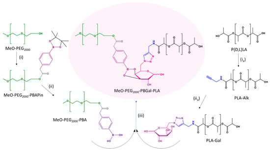 Schematic representation of the synthetic pathways designed, leading to MeO-PEG2000-PBGal-PLA. (i) PBAPin, DCC, DMAP, CHCl3, r.t. 24 h; (ii) DOWEX50WX8, THF/H2O 10:1, r.t. 24 h; (ia) Propargylamine, EDC, NHS, DMSO, r.t. 24 h; (iia) Gal-N3, CuBr, ascorbic acid, DMF, r.t., 24 h; (iii) basic conditions, aqueous or organic. The step (iii) will require further optimization, due to the instability of the PLA block under aqueous basic conditions.