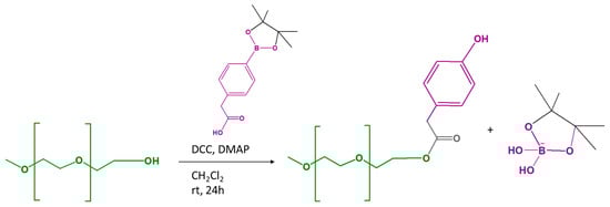 The MeO-PEG2000 was directly esterified with 4-(Carboxymethyl)phenylboronic acid pinacol ester to obtain MeO-PEG2000-PBAPin through Steglich esterification [], involving DCC and DMAP as catalyst. The pinacol moiety served as a protection and was successively cleaved to give the phenylboronic acid-terminated PEG, MeO-PEG2000-PBA. The synthesis was settled up starting from a procedure previously described by Cao et al. [] for the functionalization of PEG. It is worth noting that we found that when the esterification with PBAPin was carried out in CH2Cl2 and without the elimination of oxygen from the mixture, the 1H NMR of the purified product in DMSO-d6 showed no signal of the methyl protons of the pinacol group. The 1H NMR spectrum gave evidence of singlet signal at around 9 ppm instead. The peak had a 1:4 ratio with the protons of the aromatic group of PBA. This observation is compatible with the formation of a phenol derivative of PEG coming from oxidative cleavage of the boronic acid (Scheme 2).
