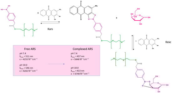 Competitive binding in three components assay to determine spectrophotometrically the binding constants of galactose with MeO-PEG-PBA. Kars: binding constant between Ars and MeO-PEG2000-PBA; Kexc: constant which governs the competitive equilibrium ARS/MeO-PEG2000-PBA + Gal
