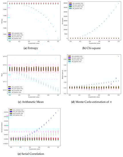 To test what thresholds the ENT battery is or is not capable of detecting, a wide range of parameters will be considered. The three generators are parameterized, respectively, by , and t. For the experiment shown in this paper, 21 parameter values are taken, varying them from 0 to 1 (both inclusive) with jumps. For each parameter value, 100 files are taken, resulting in 2100 files for each generator. To unify the nomenclature of the parameters in the experimentation, they will be denoted by . The file sizes are 13 MB, 10 MB and 1 MB, respectively. In our notation, we will refer to , as is the usual convention in science, not the that would be in computer science. To have a benchmark against which to test the biases, we will use 10,000 files from /dev/urandom.