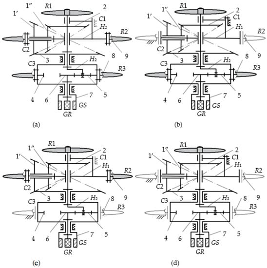 The approach starts from a “variable” structure, based on setting the clutches C1… C3 (Figure 1); this structure contains: three wind rotors (a permanent primary rotor R1 and two secondary rotors R2 and R3 activated by clutches C2 and C3, respectively), a planetary gear set with bevel gears I ≡ 2-1″-1′-3-H1 (equipped with clutch C1 for blocking the satellite carrier H1) and a differential cylindrical planetary gear set II ≡ 4-5-6-H2 with two counter-rotating outputs, 6 and 7, secured to the rotor GR and the stator GS, respectively.