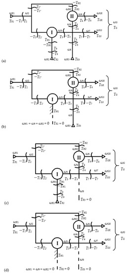 The following set of static equations in steady-state conditions is obtained based on the torque equations that come from the modeling of the two planetary gear sets, according to Equations (1) and (2), and the equations of static equilibrium for the shafts isolated from the WSCG—Case A (Figure 2a):