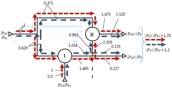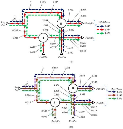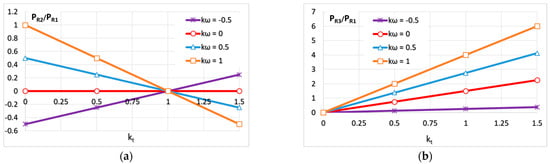 The power flow is further analyzed comparatively, considering the input data from Table 4 and certain representative values and . According to Table 3, the powers in Case A depend on both the ratio and ; in Case B, only on , and in Case C, only on , while, in Case D, they are not influenced by these ratios.