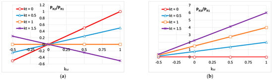 Reduced input power variations depending on the ratio for various values of ratio : (a) reduced power of the wind rotor R2; (b) reduced power of the wind rotor R3 (Case A).