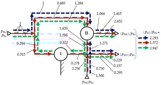 The transmission with three inputs (Case A, Figure 1a) is characterized by two independent external speeds; for instance, and . For simplicity, it is preferable to use the input speed ratio as an independent variable instead of the speed . According to Figure 2a, the following correlations related to the connections between the WSCG components can be added to the kinematic equations in Systems (1) and (2):