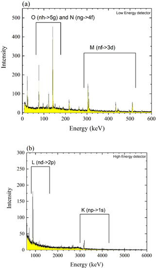 Given the bigger mass of the muon compared to that of the electron, muonic X-rays are highly energetic (from 0.01 MeV to 6 MeV), even for low Z materials (Figure 2). In most cases, the probability of the muon’s atomic capture is estimated to be proportional to the total number of electrons, as reported in Fermi and Teller [12] (although, some detailed models have been developed to account for some inconsistencies [13,14,15]). The detection of these high energy X-rays (and gamma) emitted from the muonic atom is the basis of the technique. Since the radiations are characteristic of the emitting atom (Figure 3), muonic atom X-ray spectroscopy is a very effective probe for non-destructive elemental characterization.