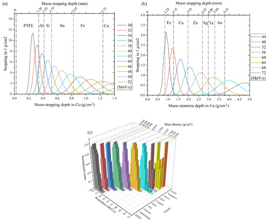 Muon depth distribution over a set of different momentum: (a) lower momentum; (b) higher momentum; (c) characteristic X-ray energy distribution. (a,b) The stopping depth was calculated by taking copper as reference material, taking into account a momentum spread of 4%. The expected locations of the sample material boundary in this reference scale are shown by the dotted vertical lines, while the accumulative thickness is reported on the top axis. For a more detailed survey on particle ranges in material, see Section 34 “Passage of particles through matter” (Figure 34.4) in [22]. (c) The 3D graph shows the distribution of the characteristic muonic X-ray intensity of the elements present in the different layers, with the penetration depth (in g/cm2) reported on the top axis. The data and the figure were taken and adapted from Ref. [23].