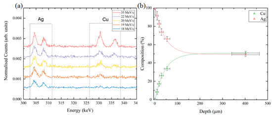 Alongside the depth profiling, elemental analysis was performed. From the momentum scan, it is visible that at low momentum (surface or near-surface) only silver peaks are visible while going further into the sample, copper peaks are present (Figure 7a). The depth dependency is confirmed also by the elemental analysis, which clearly shows a surface enrichment of about 100 µm thickness (Figure 7b).