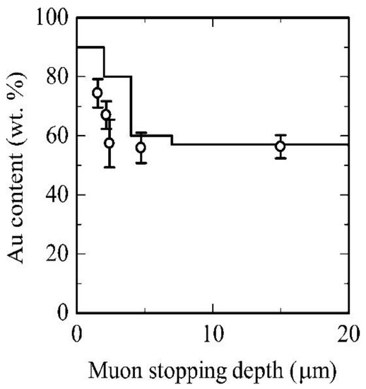 Gold variation within the sample thickness. Reprinted with permission from “Nondestructive Elemental Depth-Profiling Analysis by Muonic X-ray Measurement”. K. Ninomiya, M. K. Kubo, T. Nagatomo, W. Higemoto, T. U. Ito, N. Kawamura, P. Strasser, K. Shimomura, Y. Miyake, T. Suzuki, Y. Kobayashi, S. Sakamoto, A. Shinohara, T. Sait. 2015, Analytical Chemistry, Vol. 87, pp. 4597–4600, Ref. [21] Copyright (2015) American Chemical Society.