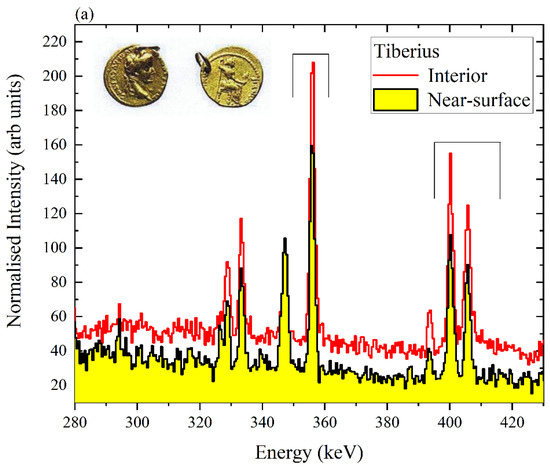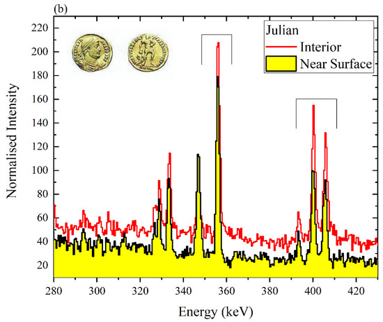 Spectra of Tiberius (a) and Julian (b) measured coins. Gold is present in both coins with a double peak at 400 keV and 406 keV and a gamma peak at 355 keV. As mentioned before, the surface (yellow) is representative of the interior (red). Reprinted with permission from Ref [37] © 2021, Elsevier Ltd.