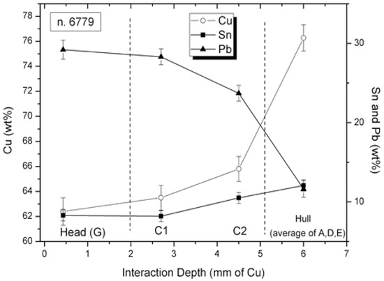 Depth profile of copper, tin and lead concentration (wt.%) of the neck of the boat in boat n.6779. The tin concentration is similar in all the measured areas, while lead and copper vary more significantly.