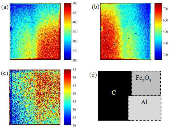 The number of events at (a) 66 keV (Aluminum), (b) 75 keV (Carbon) and (c) 131 keV (Oxygen), corresponding to the position of the material in the sample (d). Originally published in JPS Conf. Proc. 21, 011042 (2018). Reprinted with permission from Ref. [53] © 2018 The Author(s) of Ref. [53].