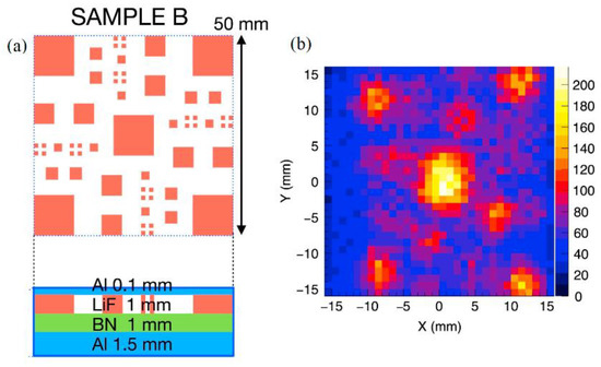 In [54], instead, a pinhole setup was used. In this study, the sample was composed of four different layers, one of which was made of small squares of lithium fluoride, as shown in Figure 13a. From the result, the LiF squares are resolved by the detector, as shown in Figure 13b, which covers the range from 27 keV to 35 keV. These two preliminary studies show the possibility of direct imaging: by adding the information coming from depth profiling, one can develop a three-dimensional analysis.